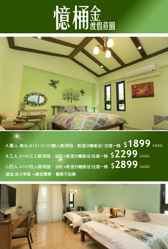 只要1899元起,即可享有【花蓮-憶桶金渡假莊園】來花蓮住莊園A.雙人/B.三人/C.四人〈含A.南北/A101/A103雙人房(附設:乾溼分離衛浴) / B.A105三人房(附設:浴缸+乾溼分離衛浴) / C.A107四人房(附設:浴缸+乾溼分離衛浴) 住宿一晚 + 活力早餐〉